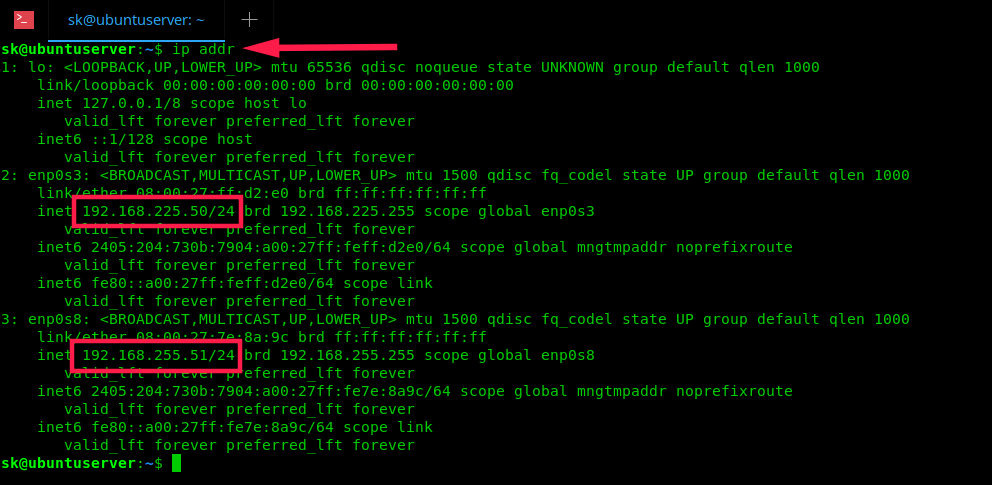 可以看到這邊有兩個(gè)網(wǎng)卡,分別是 enp0s3 和 enp0s8 ,并且這兩個(gè)網(wǎng)卡都配置為從 DHCP 服務(wù)器中獲取 IP。
