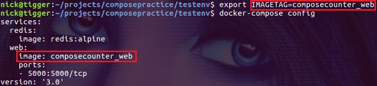 $ export COMPOSE_PROJECT_NAME=TestVar $ export COMPOSE_FILE=~/projects/composecounter/docker-compose.yml