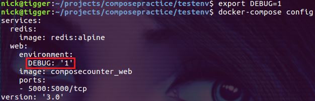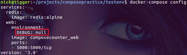 這種情況下,如果沒(méi)有在當(dāng)前的 shell 中導(dǎo)出環(huán)境變量 DEBUG,compose file 中會(huì)把它解釋為 null:
