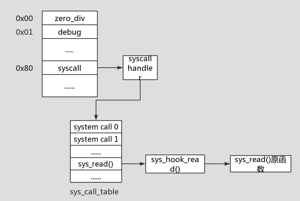 最近發(fā)現(xiàn)在4.4.0的內(nèi)核中有513多個(gè)系統(tǒng)調(diào)用(很多都沒用過),系統(tǒng)調(diào)用劫持的目的是改變系統(tǒng)中原有的系統(tǒng)調(diào)用,用我們自己的程序替換原有的系統(tǒng)調(diào)用。Linux內(nèi)核中所有的系統(tǒng)調(diào)用都是放在一個(gè)叫做sys_ call _table的內(nèi)核數(shù)組中,數(shù)組的值就表示這個(gè)系統(tǒng)調(diào)用服務(wù)程序的入口地址。整個(gè)系統(tǒng)調(diào)用的流程如下: