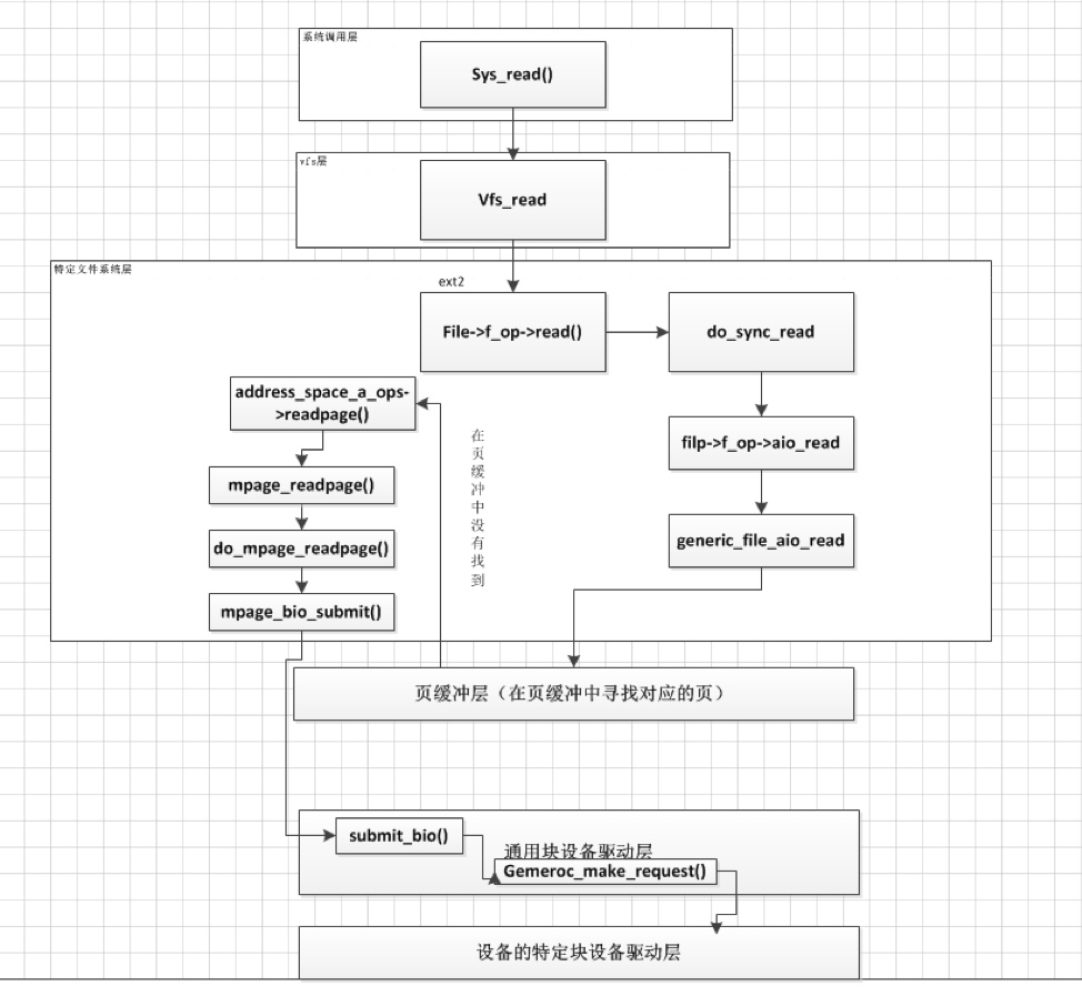 Linux通過vfs虛擬文件系統(tǒng)來統(tǒng)一抽象具體的磁盤文件系統(tǒng),從上到下的IO棧形成了一個(gè)堆棧式。通過對(duì)內(nèi)核源碼的分析,以一次讀操作為例,從上到下所執(zhí)行的流程如下: