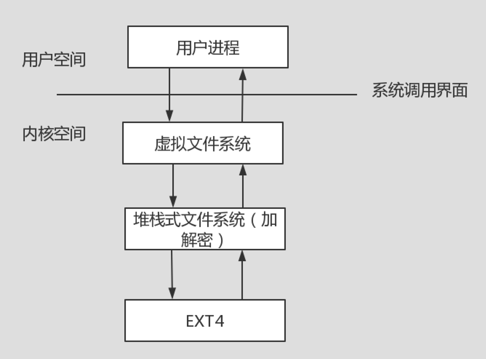 內(nèi)核中采用了很多c語(yǔ)言形式的面向?qū)ο?,也就是函?shù)指針的形式,例如read是vfs提供用戶的接口,具體底下調(diào)用的是ext2的read操作。我們只要實(shí)現(xiàn)VFS提供的各種接口,就可以實(shí)現(xiàn)一個(gè)堆棧式文件系統(tǒng)。Linux內(nèi)核中已經(jīng)集成了一些堆棧式文件系統(tǒng),例如Ubuntu在安裝時(shí)會(huì)提醒你是否需要加密home目錄,其實(shí)就是一個(gè)堆棧式的加密文件系統(tǒng)(eCryptfs),原理如下: