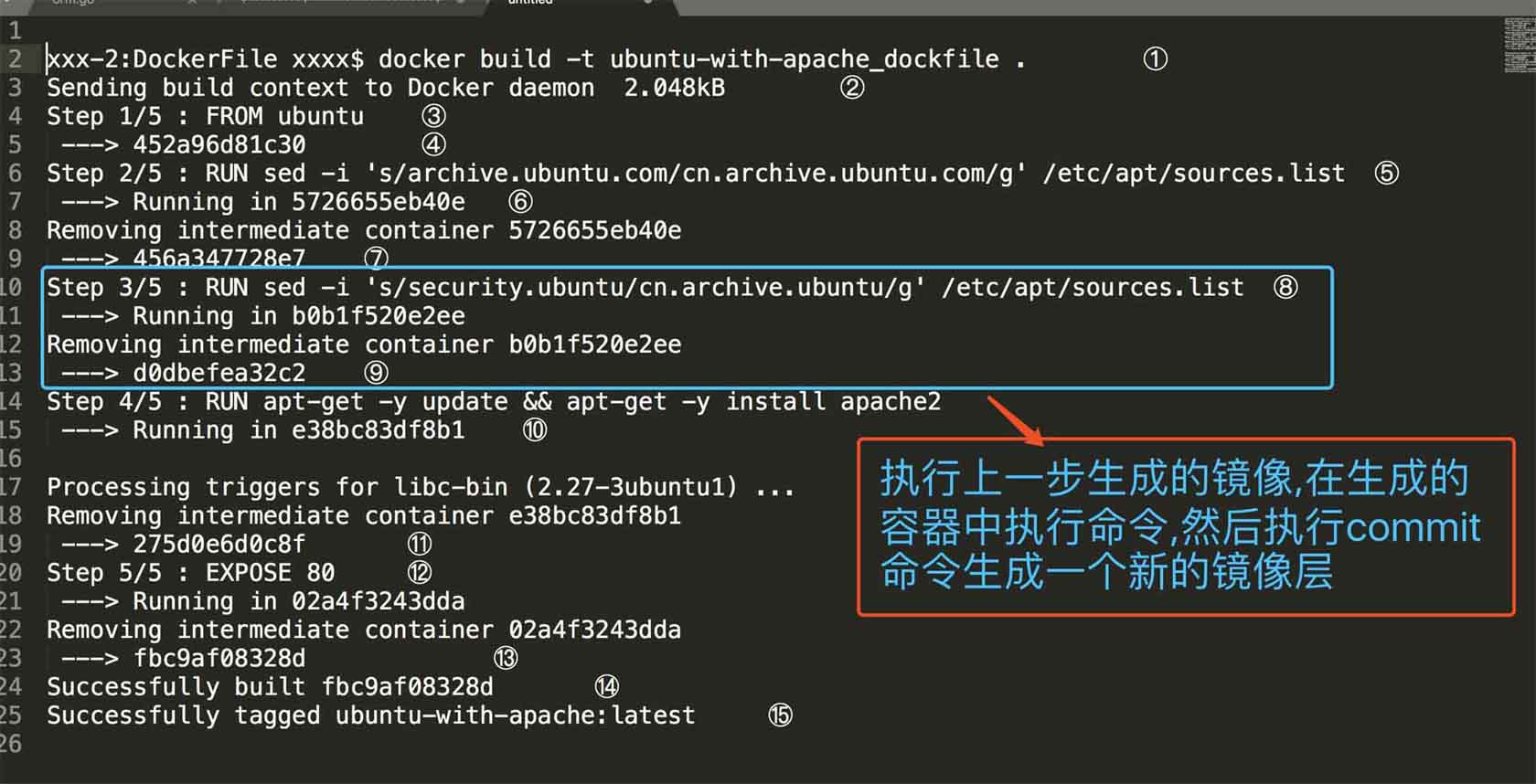 root@ubuntu:~/sample# docker build -t ubuntu_with_apache_dockerfile . ① Sending build context to Docker daemon 6.144kB ② Step 1/5 : FROM ubuntu ③ ---> 20c44cd7596f Step 2/5 : RUN sed -i 's/archive.ubuntu.com/cn.archive.ubuntu.com/g' /etc/apt/sources.list ---> Running in bac6dc3b900f ---> c66ad94ad8a4 Removing intermediate container bac6dc3b900f Step 3/5 : RUN sed -i 's/security.ubuntu/cn.archive.ubuntu/g' /etc/apt/sources.list ---> Running in 5158558b6403 ---> 0a4c480147c5 Removing intermediate container 5158558b6403 Step 4/5 : RUN apt-get -y update && apt-get -y install apache2 ④ ---> Running in f547ce7a1b39 ⑤ …… …… ---> 118bde35120a ⑥ Removing intermediate container f547ce7a1b39 ⑦ Step 5/5 : EXPOSE 80 ---> Running in e546786de05b ---> f55d7b07365b Removing intermediate container e546786de05b Successfully built f55d7b07365b ⑧ Successfully tagged ubuntu_with_apache_dockerfile:latest