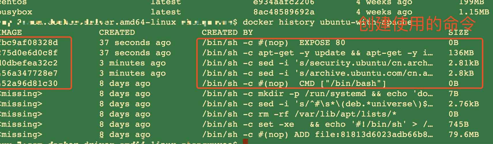 ubuntu_with_apache_dockerfile 與 ubuntu 鏡像相比,確實(shí)只是多了幾層,Dockerfile 中的每個(gè)指令都會(huì)創(chuàng)建一層,docker history 也向我們展示了鏡像的分層結(jié)構(gòu),每一層由上至下排列。