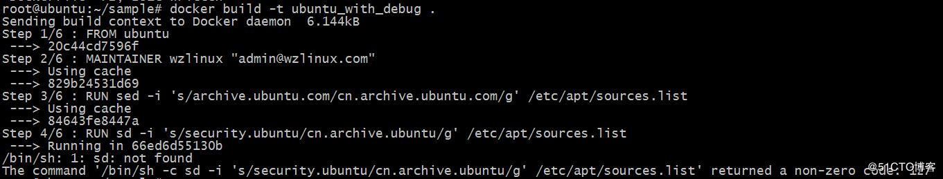 包括 Dockerfile 在內(nèi)的任何腳本和程序都會(huì)出錯(cuò)。有錯(cuò)并不可怕,但必須有辦法排查,那我們測(cè)試一下在構(gòu)建的過程中指令出現(xiàn)錯(cuò)誤怎么辦,比如我們把第二個(gè)sed指令寫錯(cuò)了,寫錯(cuò)了sd。