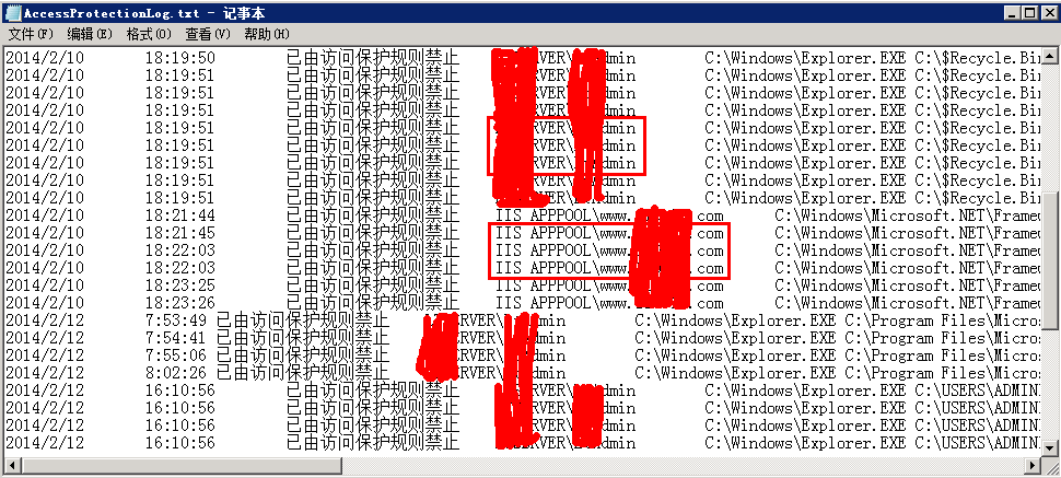 從日志這里,你可以看到是什么用戶在操作的,運行的是那個程序,做什么操作的時候給阻止的。一般來說我們服務器是做網站用的,如果這里禁用的是SYSTEM或IIS的相關帳號,那么認真看看這些程序是不是網站運行必須的,是的話就放行,不是的就不用理它。而管理員帳號的操作,如果是自己操作時產生的,就臨時放行一下就可以了,如果不是的話,就要查查是不是可能給入侵了。
