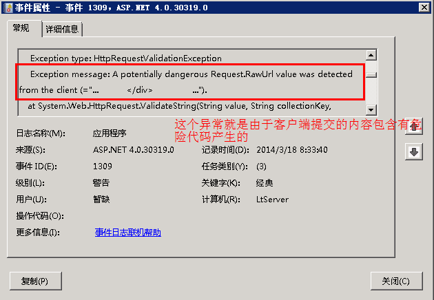 我們檢查日志,主要查看日志中的警告和錯誤信息,從中分析出那些是由于代碼問題引發(fā)的異常(將這些異常發(fā)給相關同事進行修復),那些是系統(tǒng)錯誤(判斷是防火墻規(guī)則引起的還是服務或程序出錯,判斷需不需要進行相應處理),那些是黑客在進行入侵攻擊(分析出攻擊方式后,可以在相關的代碼頁面重新進行檢查處理,以免有個別頁面存在漏洞而導致入侵成功)……對于日志中顯示的異常,其實有不少記錄并不是代碼自身引起的,比較常見的是有人使用XSS方式攻擊提交引起的異常,對于這些異??梢圆挥萌ダ頃?,只要做好頁面提交入口的SQL注入與XSS攻擊過濾操作就沒有問題。