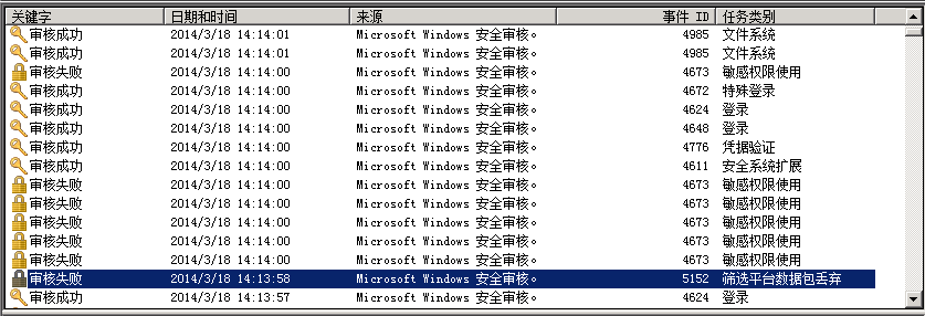 對于安全事件日志,查看審核成功與失敗的記錄都要認真看看,主要注意下面內容:正?;蚴〉牡顷懪c注銷時間,看看是否是服務器管理員自己上來的,看看是否有非自己創(chuàng)建的帳號;留意是否存在批處理登陸事件(及有可能入侵成功了);各種帳號管理事件與安全組管理事件(入侵成功后可能會創(chuàng)建帳號、修改密碼或刪除帳號等操作,這些都會被記錄下來);審核策略更改事件(是否是管理員自己更改的,如果不是自己的是其他管理員的話,檢查一下更改了什么)。具體可以百度一下《審核WINDOWS安全日志》認真研究一下各種審核事件說明。