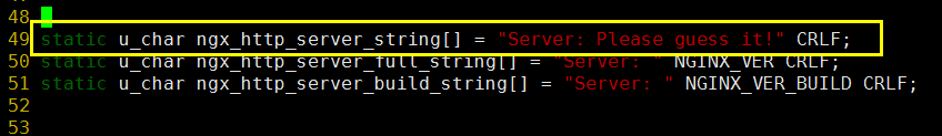 static u_char ngx_http_server_string[] = "Server: Please guess it!" CRLF; #Server后寫上你自定義的服務(wù)器信息