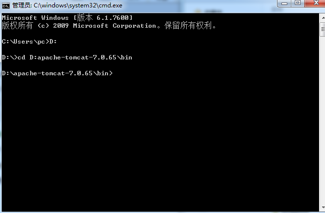 第一步:使用cmd命令進(jìn)入到你的tomcat文件下的bin目錄,我的tomcat在D盤