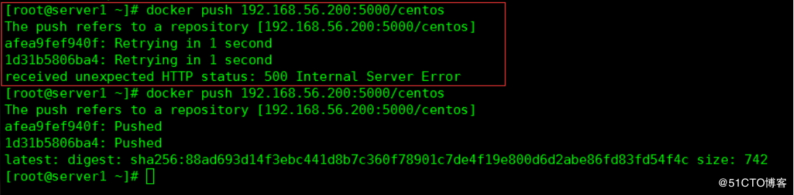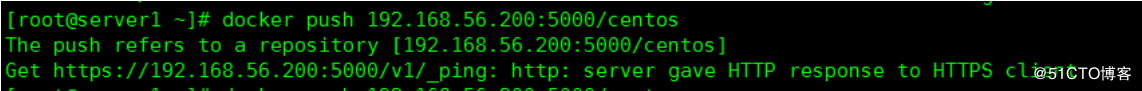 [root@server1 ~]# docker push 192.168.56.200:5000/centos The push refers to a repository [192.168.56.200:5000/centos] Get https://192.168.56.200:5000/v1/_ping: http: server gave HTTP response to HTTPS client