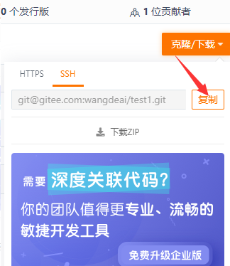 輸入命令:git clone git@gitee.com:wangdeai/test1.git