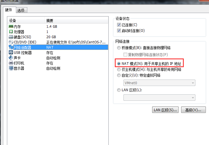 2.虛擬機(jī)->設(shè)置->網(wǎng)絡(luò)適配器->選擇NAT模式