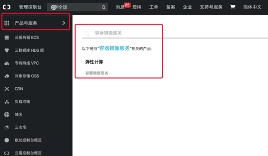 首先登錄阿里云, 然后從服務(wù)中找到容器鏡像服務(wù)所在的位置, 如下圖所示: