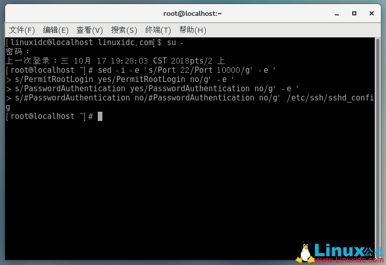 您可以使用-e開(kāi)關(guān)一次指定多個(gè)更改。 同樣,sshd_config.conf文件使得更改多行變得簡(jiǎn)單。 下面的腳本可能看起來(lái)很復(fù)雜,但操作系統(tǒng)只是傳遞多個(gè)sed更改數(shù)據(jù)包,每個(gè)數(shù)據(jù)包前綴為-e。