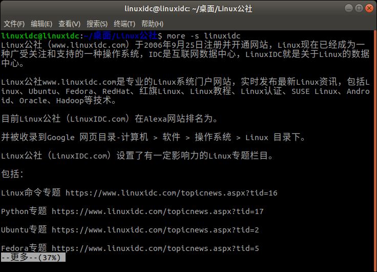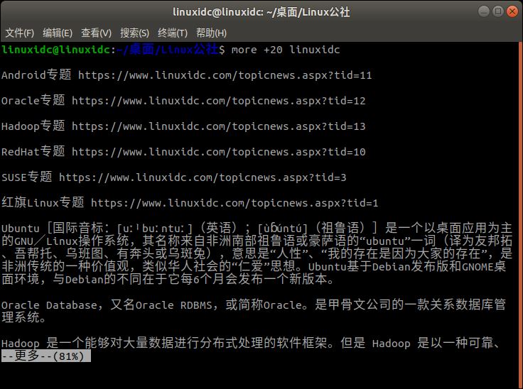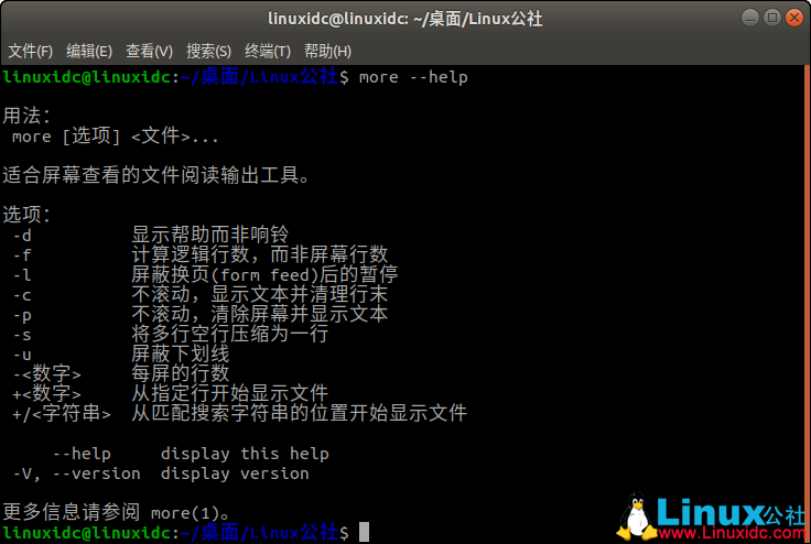 linuxidc@linuxidc:~/桌面/Linux公社$ more --help