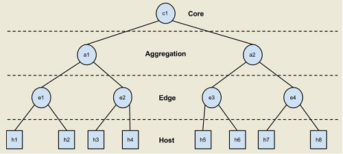 在這個(gè)任務(wù)中,你的任務(wù)是創(chuàng)建一個(gè)簡單的樹拓?fù)浣Y(jié)構(gòu)。您將假定每個(gè)級(jí)別,即 core, aggregation, edge and host,由具有可配置扇出值(k)的單層交換機(jī)/主機(jī)組成,看起來像: