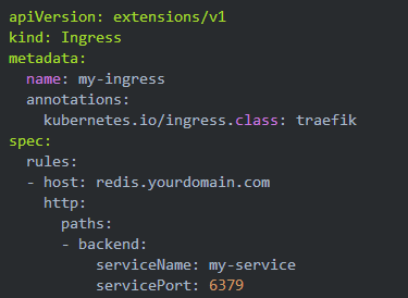 這一節(jié)配置是告訴Traefik你希望所有名為redis.yourdomain.com的主機(jī)上的流量都轉(zhuǎn)發(fā)到我的服務(wù)端口6379。據(jù)我所知,這只是針對(duì)Traefik的配置。 在應(yīng)用配置后,Pod將通過redis.yourdomain.com上的Traefik暴露到互聯(lián)網(wǎng)。