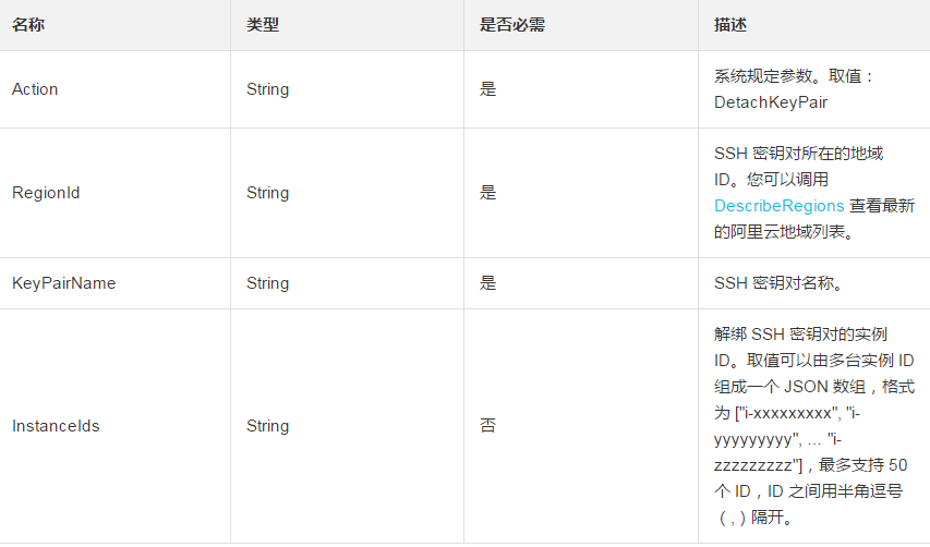 https://ecs.aliyuncs.com/?Action=DetachKeyPair &RegionId=cn-qingdao &InstanceIds=["i-xxxxxxx", "i-yyyyyyy"] &KeyPairName=test &<公共請求參數(shù)>