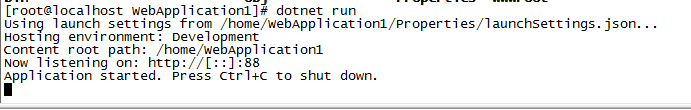 [root@localhost ~]# cd /home/WebApplication1/ [root@localhost WebApplication1]# dotnet run Using launch settings from /home/WebApplication1/Properties/launchSettings.json... Hosting environment: Development Content root path: /home/WebApplication1 Now listening on: http://[::]:88 Application started. Press Ctrl+C to shut down.