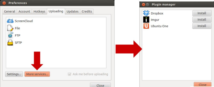 除了支持 ScreenCloud 本身的圖片分享服務(wù)外,它還支持 FTP 及 SFTP ,最新版還支持 Dropbox , Imgur , Ubuntu one 等第三方存儲服務(wù)。