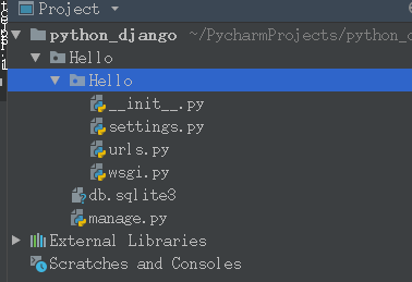 輸入命令:django-admin.py startproject Hello;(即創(chuàng)建好了一個名為Hello的項目)