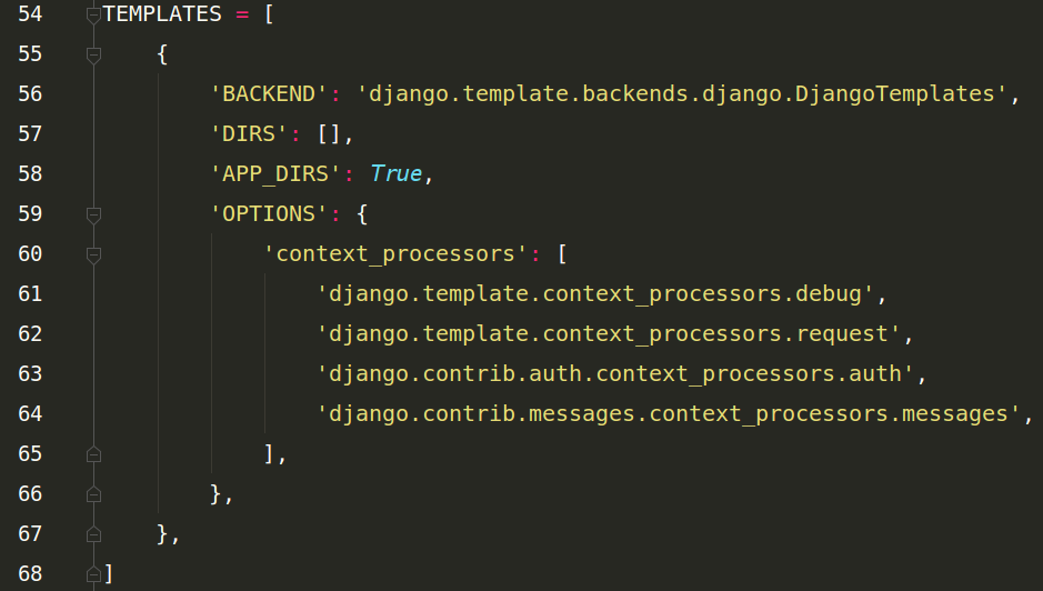 在Django中,模板就是一個一個的html文件,這里的templates就是模板的配置,暫時不用管它。后面自己寫模板時再來看。