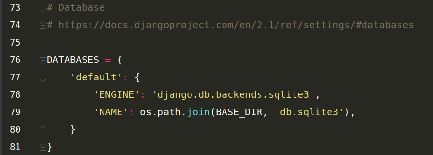 默認使用sqlite3數(shù)據(jù)庫,如果要使用其他數(shù)據(jù)庫,就去上面注釋的那個鏈接地址去查找怎樣配置,不用其他的數(shù)據(jù)庫就不用改動它。
