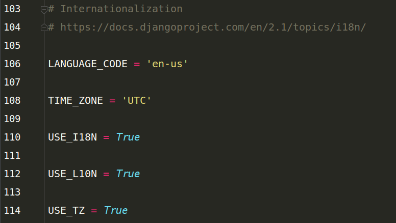 國際化,就是時間,語言之類的東西,LANGUAGE_DODE = ‘en-us',默認為英語,TIME_ZONE = 'UTC'默認時UTC 時區(qū)。