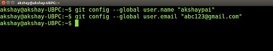 下面的圖片顯示的例子是如何用我的GitHub 用戶名:“akshaypai” 和我的郵件地址 “abc123@gmail.com ” 來配置上面的命令。