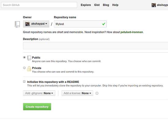 在 GitHub 上創(chuàng)建一個倉庫。請注意倉庫的名字必須和你本地創(chuàng)建的倉庫的名字嚴(yán)格一致。在這個例子里是 “Mytest”。請首先登錄你的 GitHub 賬戶 。點擊頁面右上角的 “+” 符號,并選擇“create nw repository”。如下圖所示填入詳細(xì)信息,點擊 “create repository”。