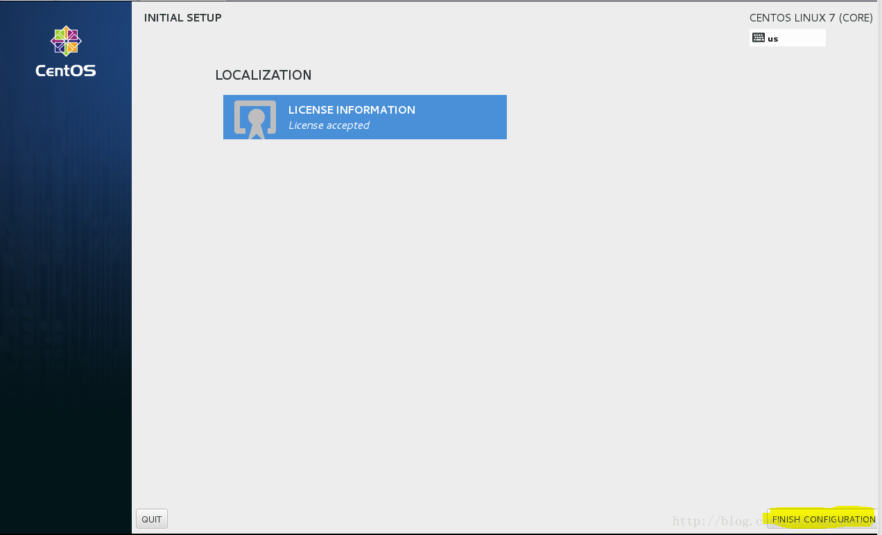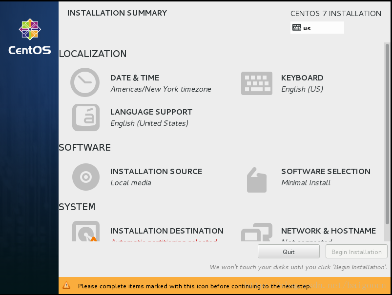 4、進入安裝配置主界面,CentOS 7主要配置工作都在此界面進行,如果沒完全設置好,Begin installation按鈕將灰選。