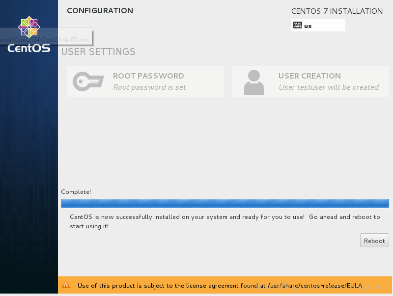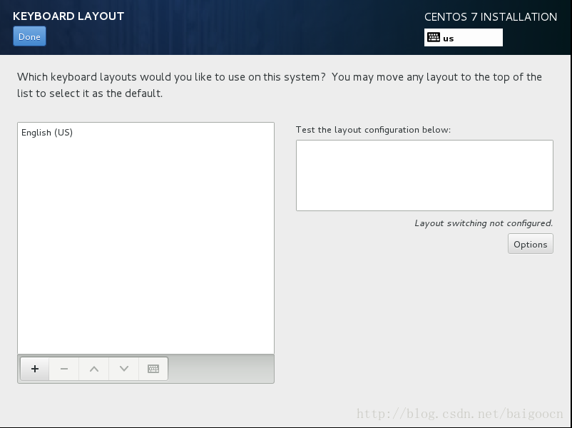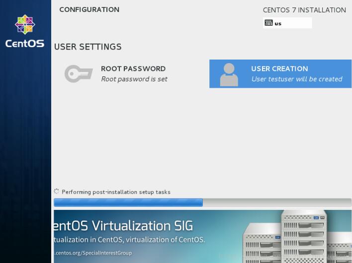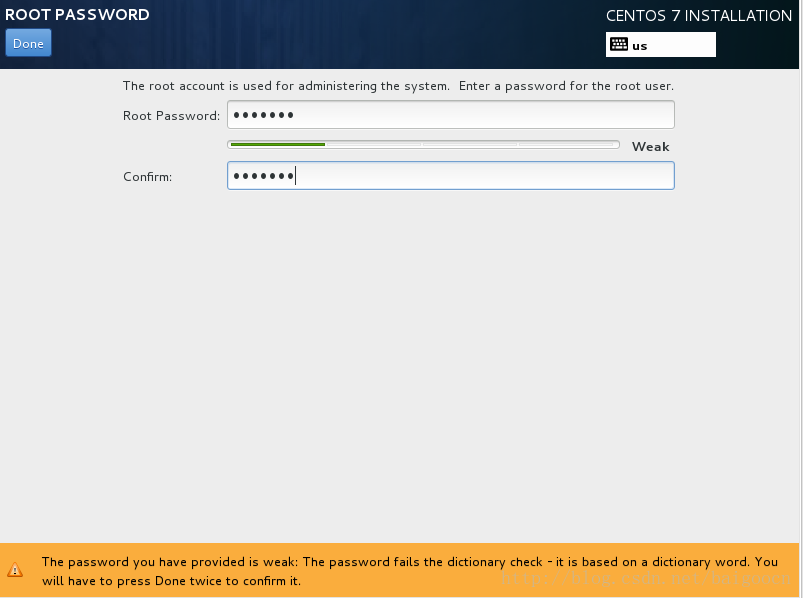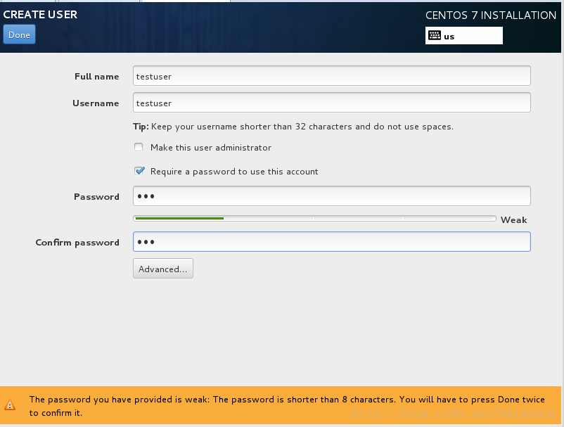 緊接著進行USER CREATION的設定,即創(chuàng)建新賬號,輸入用戶名和密碼,注意,這里的用戶是普通的用戶,就類似于Windows系統(tǒng)下的管理員和普通用戶,CentOS下的root用戶對應于Windows下的Administrarot用戶,此處創(chuàng)建的用戶對應于Windows下的普通用戶,具體設置如下圖所示,設置好后按Done返回。