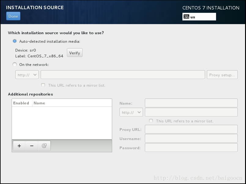 8、安裝源配置,選擇SOFTWARE中的INSTALLATION SOURCE項,本文選擇默認的安裝源。設置完按Done返回。如下圖: