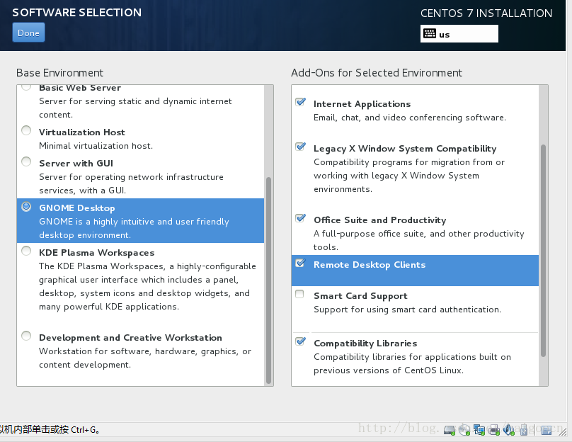 9、系統(tǒng)環(huán)境及軟件安裝,選擇SOFTWARE中的SOFTWARE SELECTION項,根據(jù)自己需要,選擇想要的環(huán)境。本文選擇GNOME Desktop環(huán)境(左側),右側為附加的一些軟件及工具,根據(jù)自己需要選擇安裝。設置完按Done返回。如下圖: