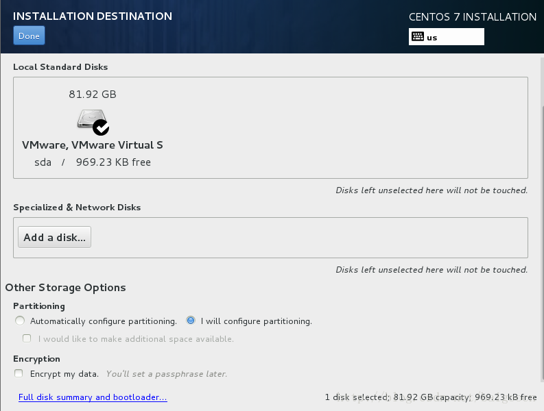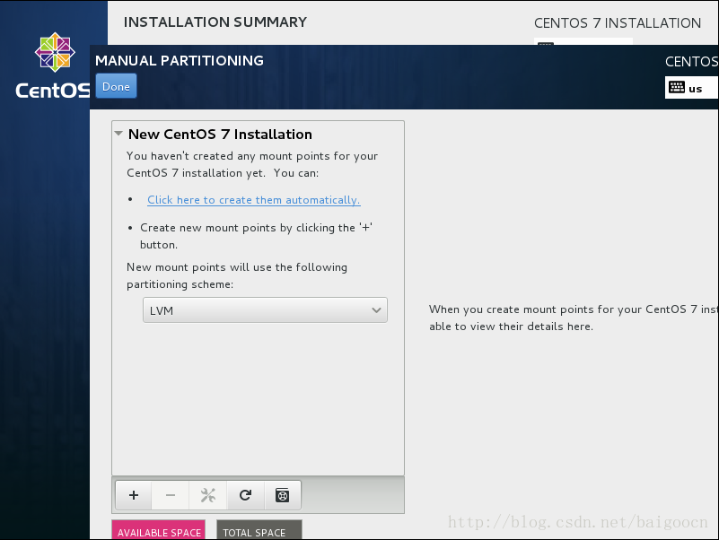 10、系統(tǒng)分區(qū)設置,選擇SYSTEM中的INSTALLATION DESTINATION項,在Other Storage Options中,選擇配置分區(qū)項“I will configure partitioning",按Done確認,見下圖: