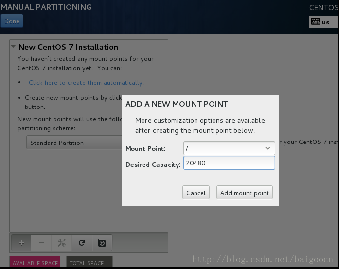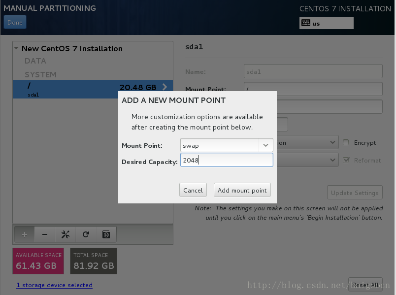 這時候點擊"+"號,新增掛載點,建立上面的兩個分區(qū),如下圖所示:
