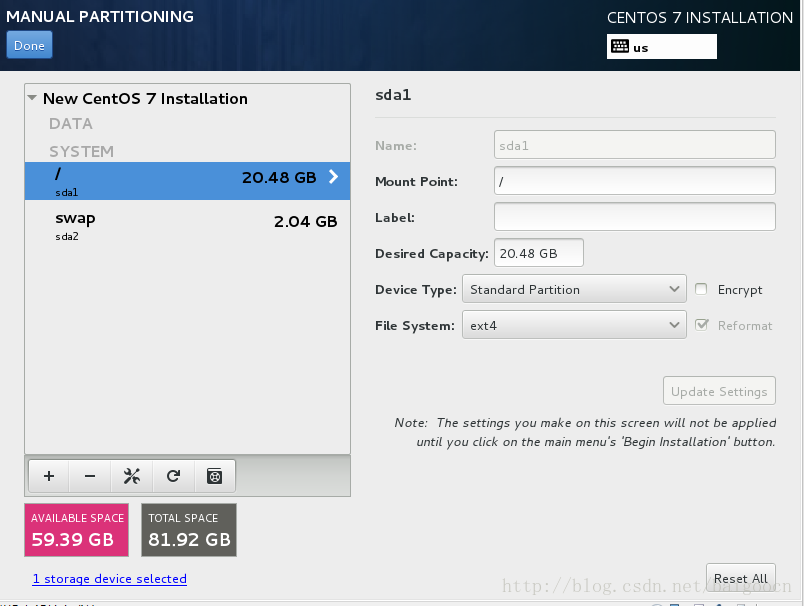 一個為根分區(qū),即"\",文件系統(tǒng)為ext4格式.