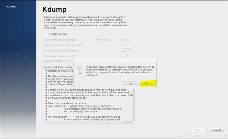 點擊"Finished configuration",進入kdump設置界面,將復選框的勾去掉,點擊"Forward"繼續(xù),點擊"Yes"確認。