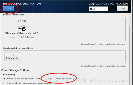 選擇-系統(tǒng)SYSTEM-安裝位置INSTALLTION DESTINATION,進入磁盤分區(qū)界面,如下圖所示: