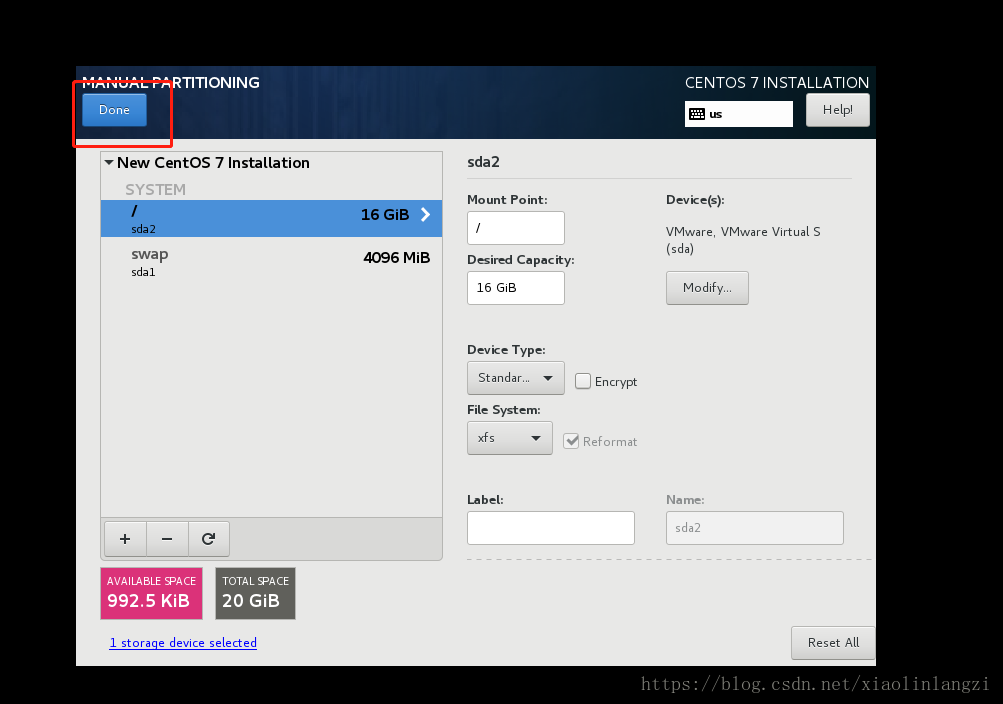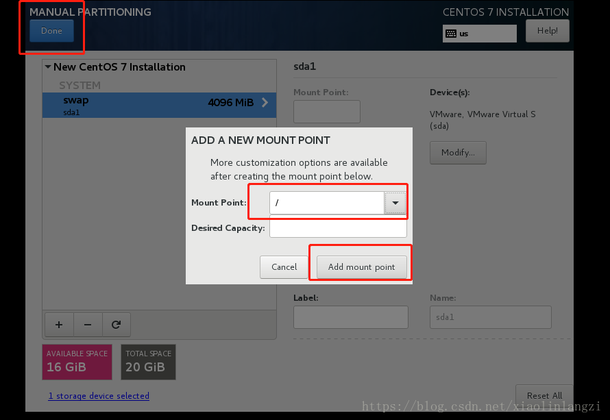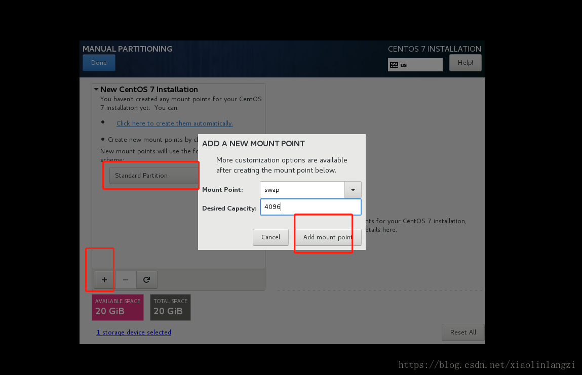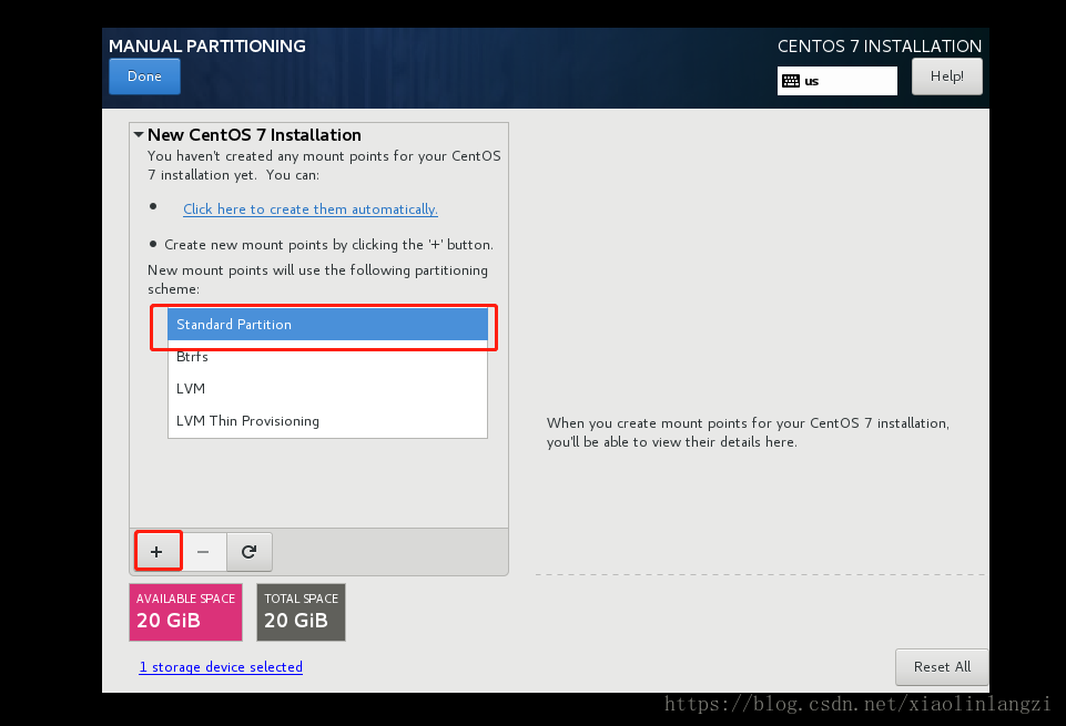 新掛載點使用以下分區(qū)方案:標準Standard Partition,完成Done。