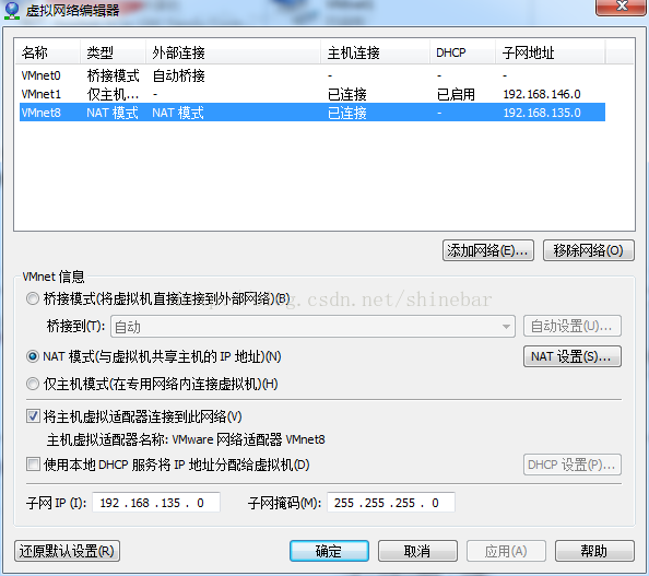 在此窗口就能看到哪個(gè)虛擬網(wǎng)卡是使用于NAT模式的。
