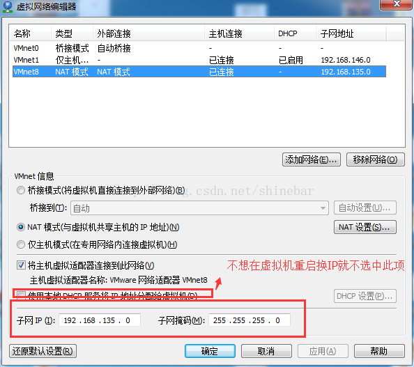 首先打開圖2,在下面配置子網(wǎng)IP和子網(wǎng)掩碼。當(dāng)然這里面沒有開啟DHCP,因?yàn)椴幌胩摂M機(jī)重啟后,換IP。所以沒有把"使用本地DHCP服務(wù)將IP地址分配給虛擬機(jī)"這一項(xiàng)勾選。