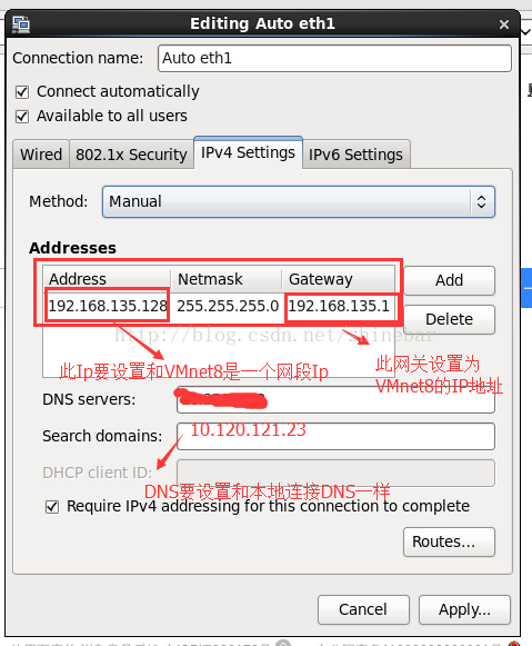 其中DNS一定要和本地連接的DNS一樣。IP地址可以設(shè)置成常用的IP,在此設(shè)置的IP地址為:192.168.135.1 子網(wǎng)掩碼:255.255.255.0。