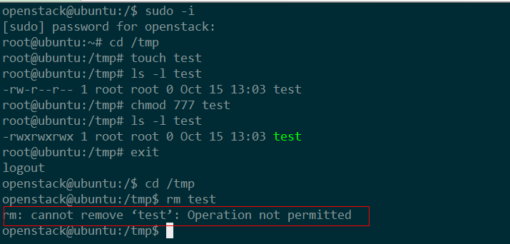 現(xiàn)在我們來驗(yàn)證下,先用root賬號(hào)在tmp文件中創(chuàng)建一個(gè)文件test,然后用openstack(其他賬號(hào))進(jìn)入該目錄,刪除test文件,看看發(fā)生什么情況