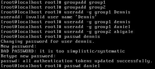【題1.1】建立兩個用戶組group1和group2,以及三個用戶dennis、daniel、abigale,并且將前2個用戶分配在group1用戶組下,后一個分配在group2用戶組下