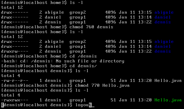 【題1.4】以dennis用戶登錄,修改目錄/home/dennis及Hello.java文件的讀寫權限(更正:修改目錄權限的時候,應該使用770,而不是760,否則權限不足)