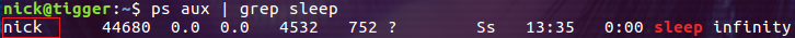 因為我們在命令行上指令了參數(shù) --user 1000,所以這里 sleep 進(jìn)程的有效用戶顯示為 nick。進(jìn)入到容器內(nèi)部看一下:
