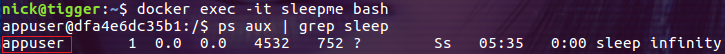$ docker run -d --user 1000 --name sleepme ubuntu sleep infinity
