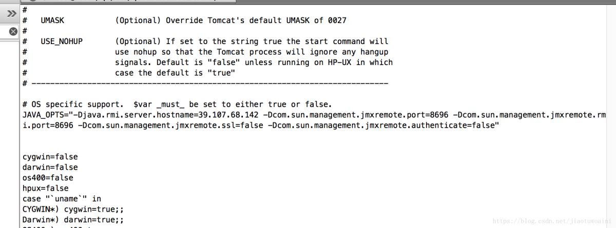 JAVA_OPTS="-Djava.rmi.server.hostname=39.107.68.142 -Dcom.sun.management.jmxremote.port=8696 -Dcom.sun.management.jmxremote.rmi.port=8696 -Dcom.sun.management.jmxremote.ssl=false -Dcom.sun.management.jmxremote.authenticate=false"